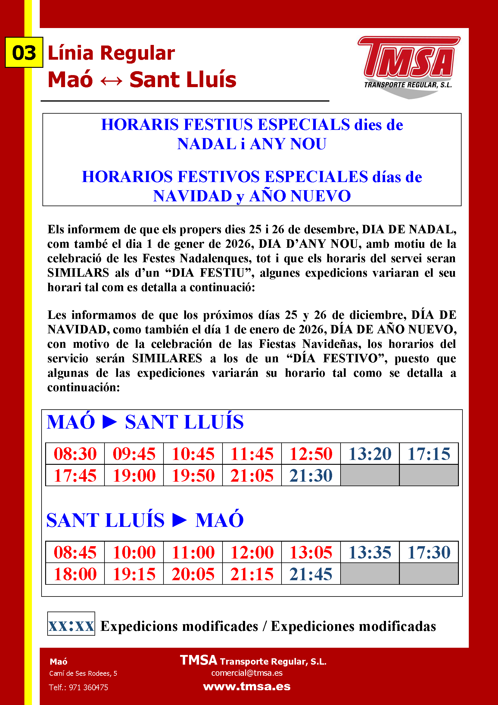 Wir informieren Sie, dass an den kommenden Tagen 25. Dezember, WEIHNACHTSTAG, und 26. Dezember, SANT ESTEVE, sowie am 1. Januar 2026, NEUJAHRSTAG, anlässlich der Weihnachtsfeiertage die Fahrpläne der Linie L03 denen eines «FEIERTAGS» ähneln werden.