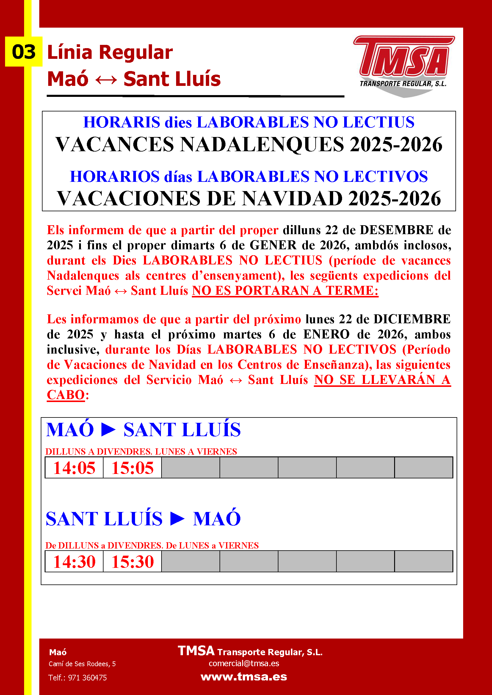 Wir informieren Sie, dass von Montag, dem 22. Dezember 2025, bis Dienstag, dem 6. Januar 2026, einschließlich, an unterrichtsfreien Werktagen während der Weihnachtsferien in den Bildungseinrichtungen bestimmte Fahrten der Linie L03 Maó ↔ Sant Lluís nicht durchgeführt werden.