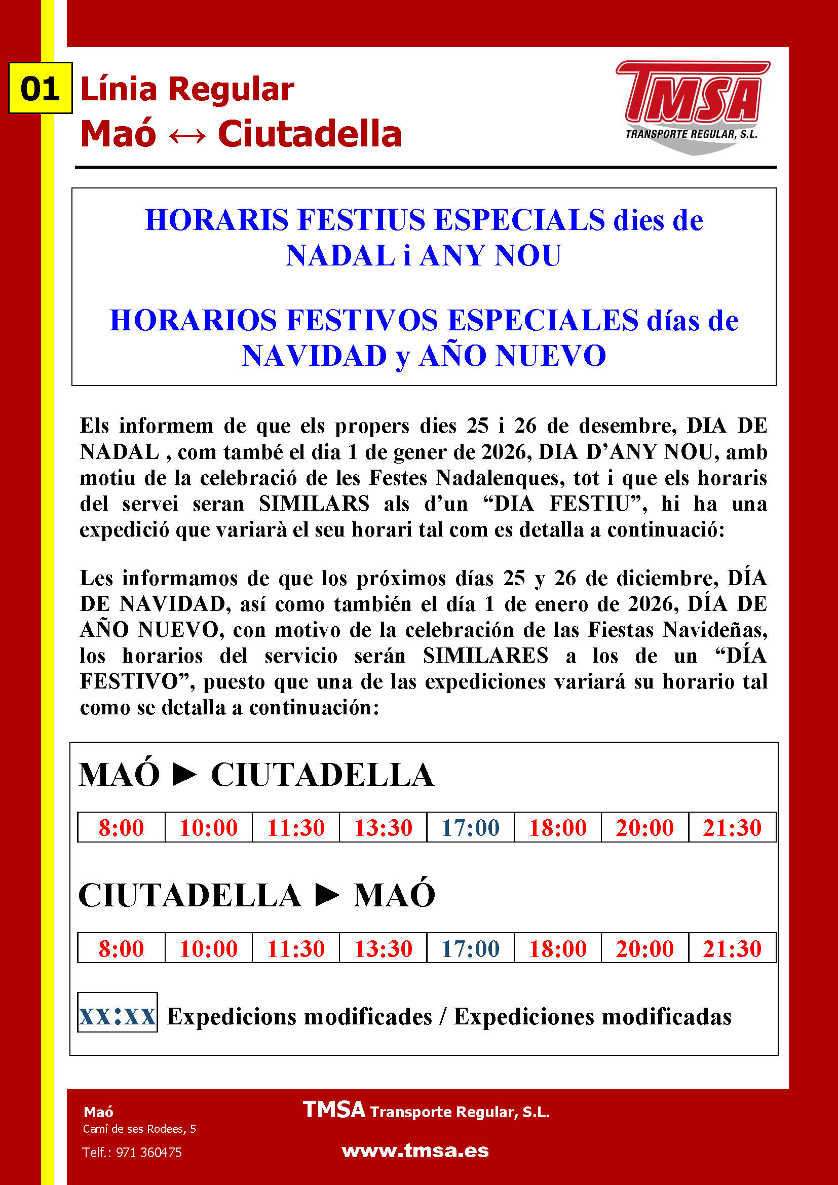 El próximo sábado 19 de julio con motivo de la celebración de las Fiestas de Es Mercadal, además de los horarios habituales, se llevarán también a cabo mediante vehículos de refuerzo los siguientes horarios especiales en la línea L01 en los trayectos Maó --> Es Mercadal y Ciutadella --> Es Mercadal.