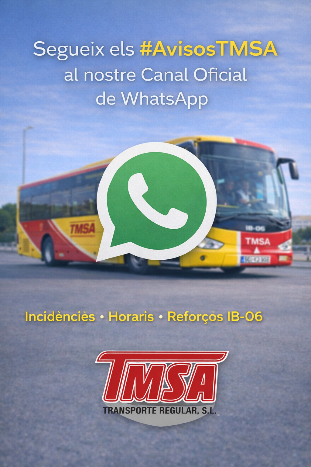 Desde ahora puedes seguir todos los #AvisosTMSA a través de nuestro nuevo Canal Oficial de WhatsApp, donde publicaremos incidencias, cambios de horario, refuerzos puntuales y comunicaciones relevantes de las líneas IB-06.